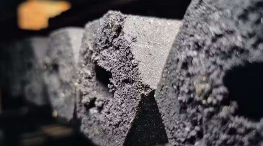 O processo de produção envolve a carbonização dos caroços, seguida da trituração até virar pó. Em seguida, o material é misturado a elementos orgânicos, como água, areia e resíduos de mandioca, para dar consistência, e levado para secagem.