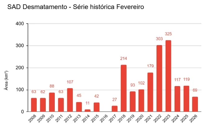 A Amazônia registrou o menor desmatamento em fevereiro dos últimos oito anos, com uma queda de 42% em relação a 2025, passando de 119 km² para 69 km². Essa redução equivale a 5 mil campos de futebol preservados no mês, quase 180 por dia.
