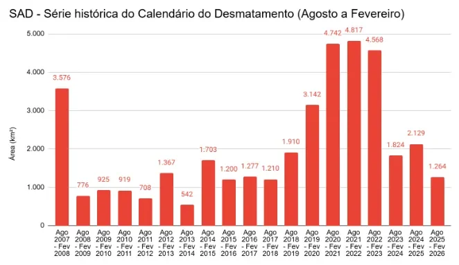 Pará, Amazonas e Acre foram os estados com as maiores áreas desmatadas entre agosto de 2025 e fevereiro de 2026, com 398 km², 200 km² e 190 km², respectivamente. Apesar disso, todos apresentaram redução na derrubada.