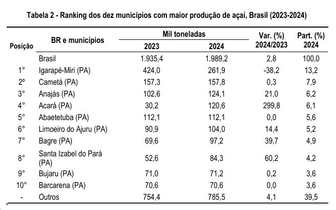 Os dados da Fapespa revelam que o Pará concentra a maior parte da produção nacional de açaí, representando mais de 90% do volume total, com aproximadamente 1,7 milhão de toneladas anuais. Igarapé-Miri detém 13,2% da produção nacional, seguida por Cametá (7,9%) e Anajás (6,2%).